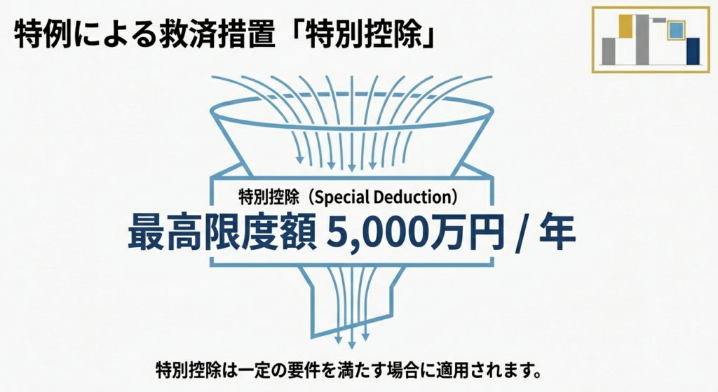 特別控除は、クライアントにとって最大の関心事です。ただし、適用には「年間5,000万円が限度」という強力なルールがあることを忘れないでください。
