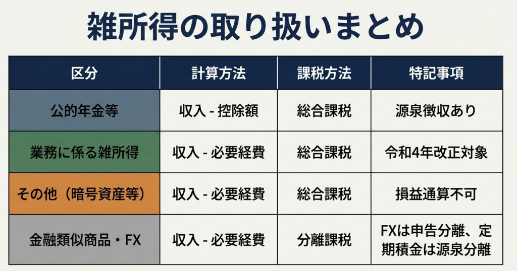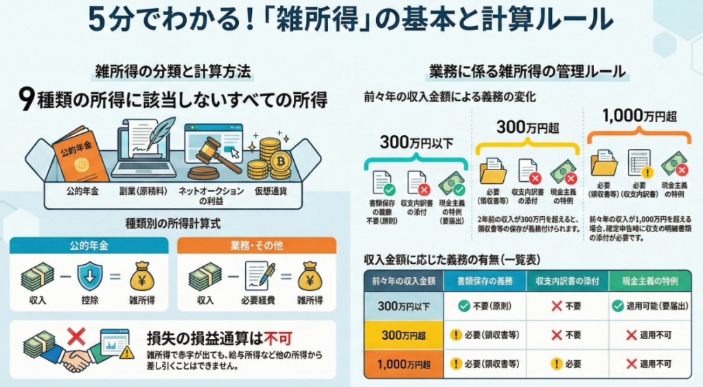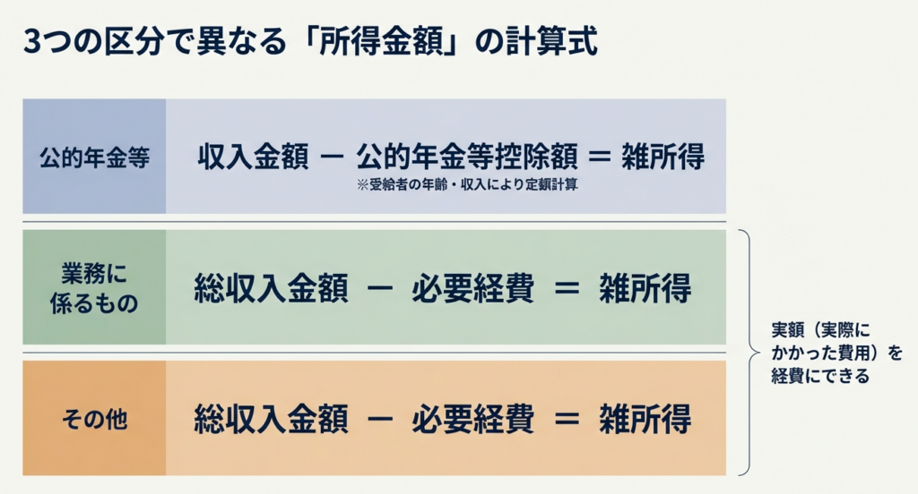 雑所得の計算は、「公的年金等」「業務」「その他」の3区分に整理されます。これらは必要経費の考え方や控除の適用が全く異なるため、混同は禁物です。
