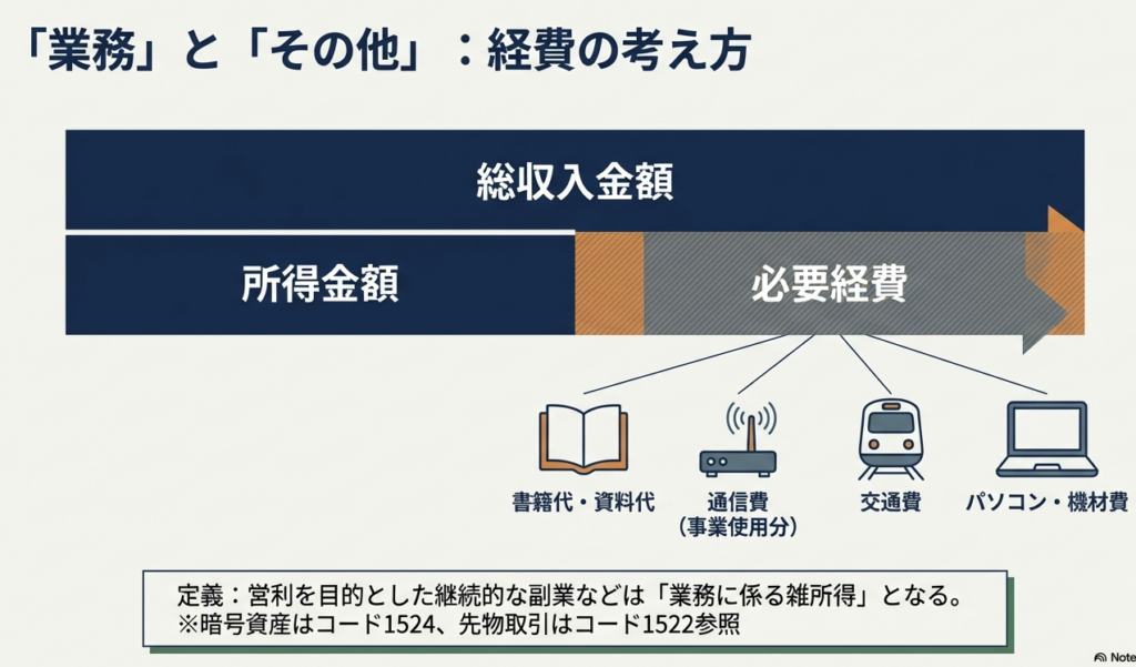 業務に係る雑所得とは、副業に係る収入のうち、営利を目的として継続的に行われるものを指します。これに該当する場合、総収入金額から必要経費を差し引いた額が所得金額となります。