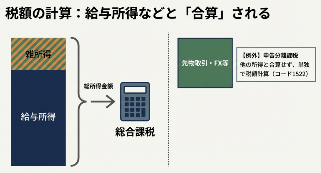 原則として、雑所得の金額を給与所得などの他の所得金額と合計して「総所得金額」を求め、その合計額に対して税額を計算する総合課税方式がとられます。ただし、一定の先物取引による所得など、申告分離課税が適用される例外も存在します。