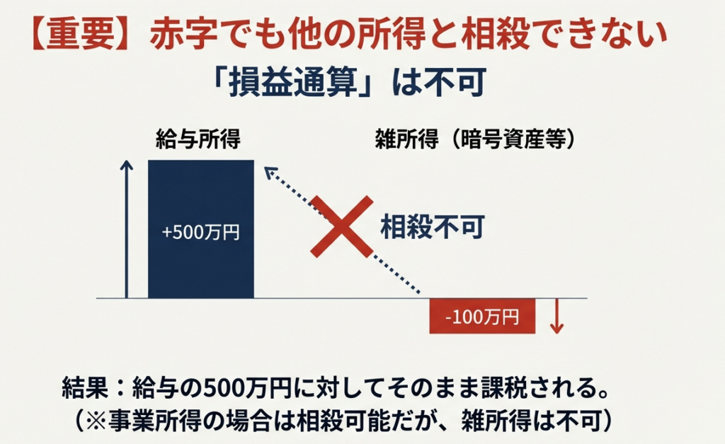 雑所得の計算上で発生した損失は、他の所得金額と「損益通算」をすることはできません。つまり、雑所得での赤字を給与所得などの黒字から差し引いて、全体の税額を低く抑えることは認められていません。
