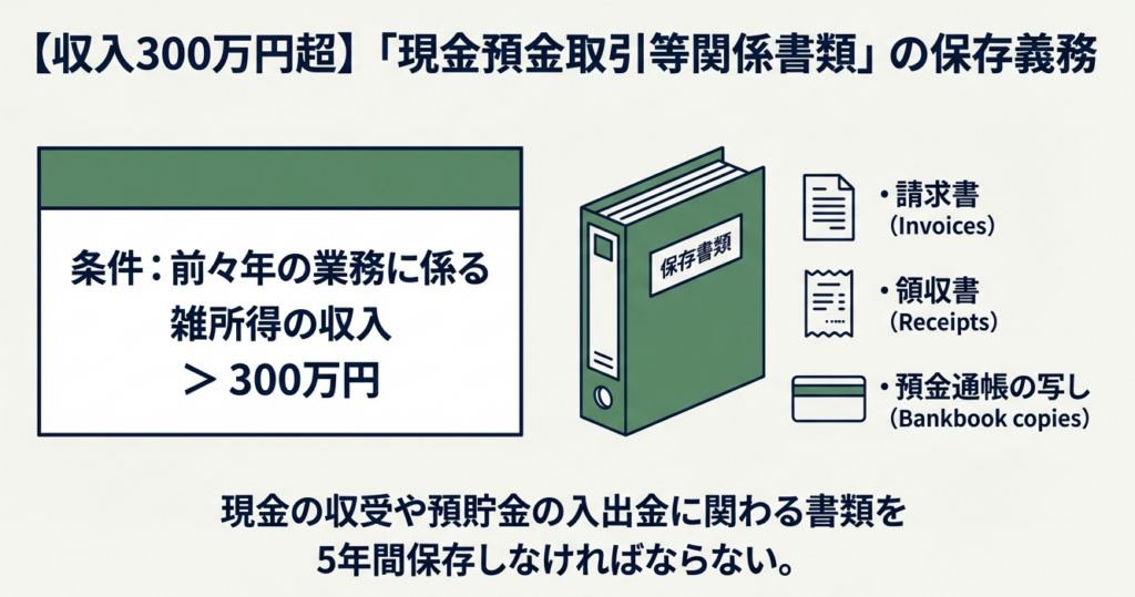 その年の前々年分の業務に係る雑所得の収入金額が300万円を超える方は、「現金預金取引等関係書類」を保存しなければなりません。これには、現金の収受や預貯金の預け入れ等に際して作成・受領した領収書や請求書などが含まれます。