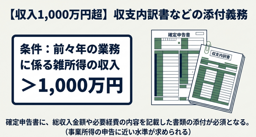 前々年分の収入金額が1,000万円を超える場合には、確定申告書を提出する際に、総収入金額や必要経費の内容を詳細に記載した「収支内訳書」などの書類を添付する義務があります。