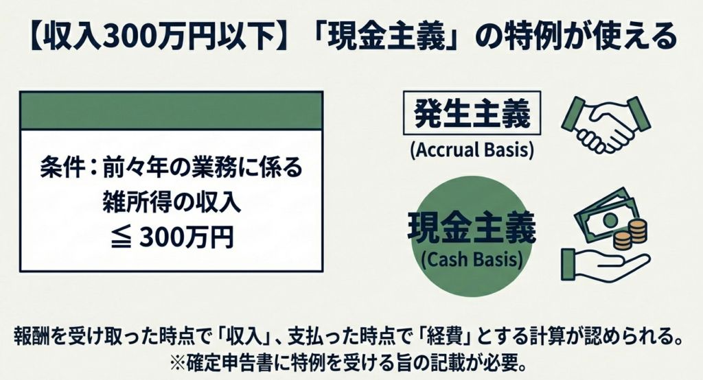 | 300万円以下 | 現金主義の特例 | 実際に収受した額で計算可能です。ただし確定申告書への記載が要件です。 |