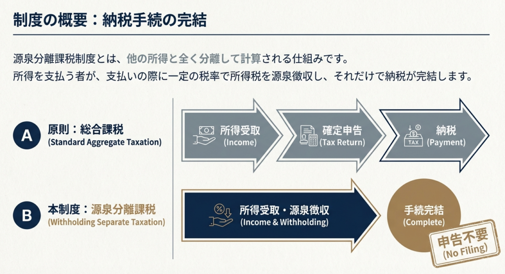 源泉分離課税が適用される所得の最終的な扱いは非常にシンプルです。「支払者が一定の税率で税金を天引きし、それで納税が完結する。その後、確定申告に含めることは一切できない」というものです。