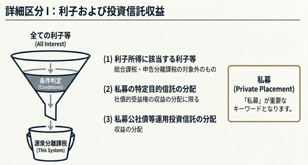 利子所得に該当する利子等のうち、総合課税または申告分離課税の対象となるものを除いたものが対象となります。これには、銀行預金の利子などが含まれます。