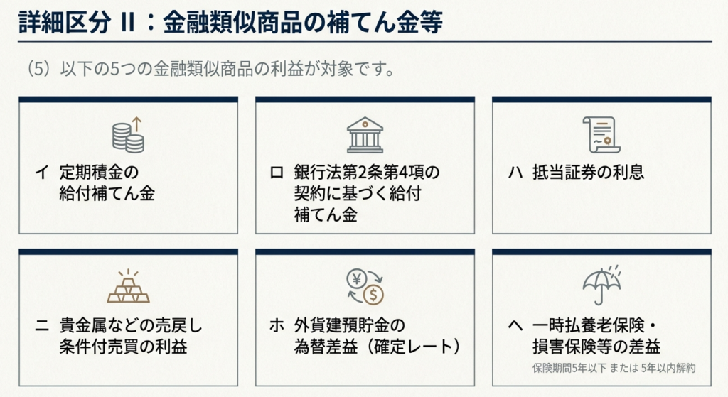| 金融類似商品 | 定期積金の給付補てん金、抵当証券の利息、特定の保険差益など、預貯金に類似した性質を持つ金融商品の総称。 |