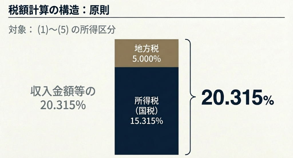 原則として、収入金額等の20.315パーセントが適用されます。これには所得税、復興特別所得税、および地方税が含まれています。