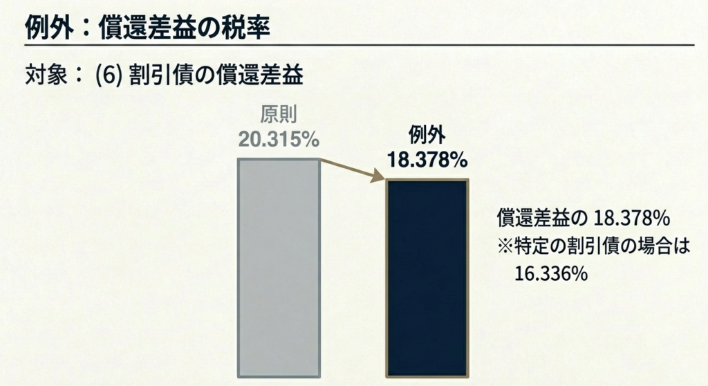 | 割引債の償還差益 | 一定の割引債の償還差益(特定のものは16.336%) | 18.378% |