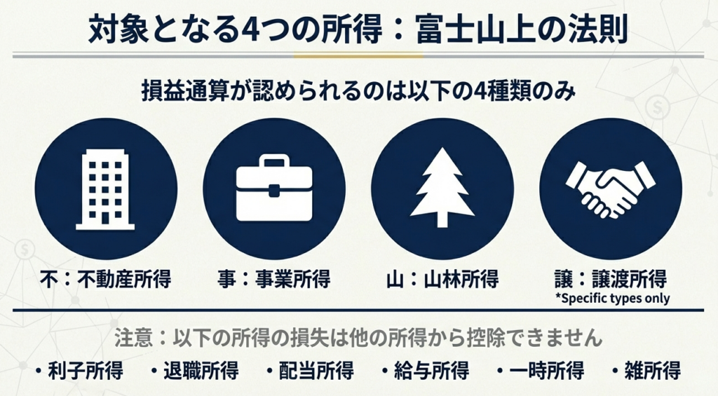の4種類に限定されています。これら以外の所得区分で損失が生じても、原則として他の所得と通算することはできません。