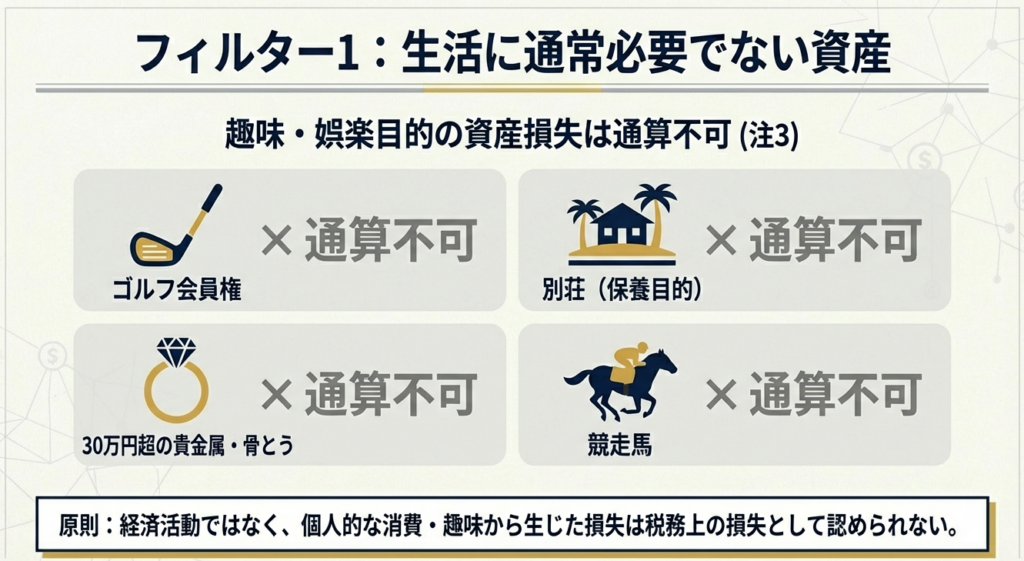 譲渡所得で損失が出ている場合、その資産が「生活に通常必要でない資産(別荘や30万円超の貴金属等)」に該当しないか、クライアントへのヒアリングや資料確認を徹底してください。