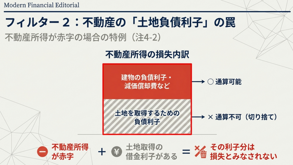 不動産所得を生ずべき土地(土地の上に存する権利を含む)を取得するために要した負債の利子に相当する部分は、損益通算の対象外です。この部分の損失は、なかったものとみなされ、他の所得から控除することはできません。