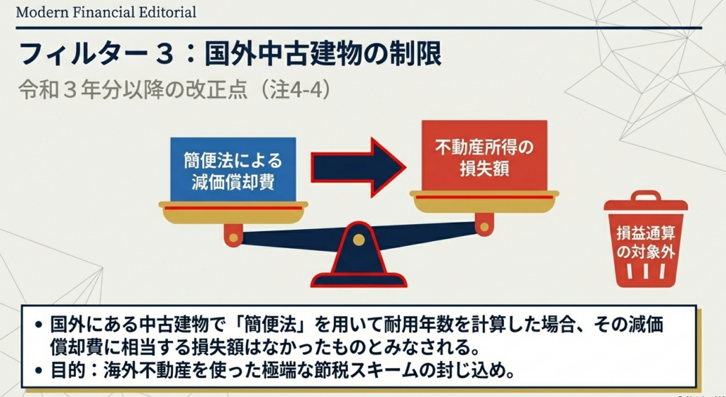 第7問: 国外中古建物から生じた不動産所得の損失について、令和3年分以降どのような制限が設けられていますか。