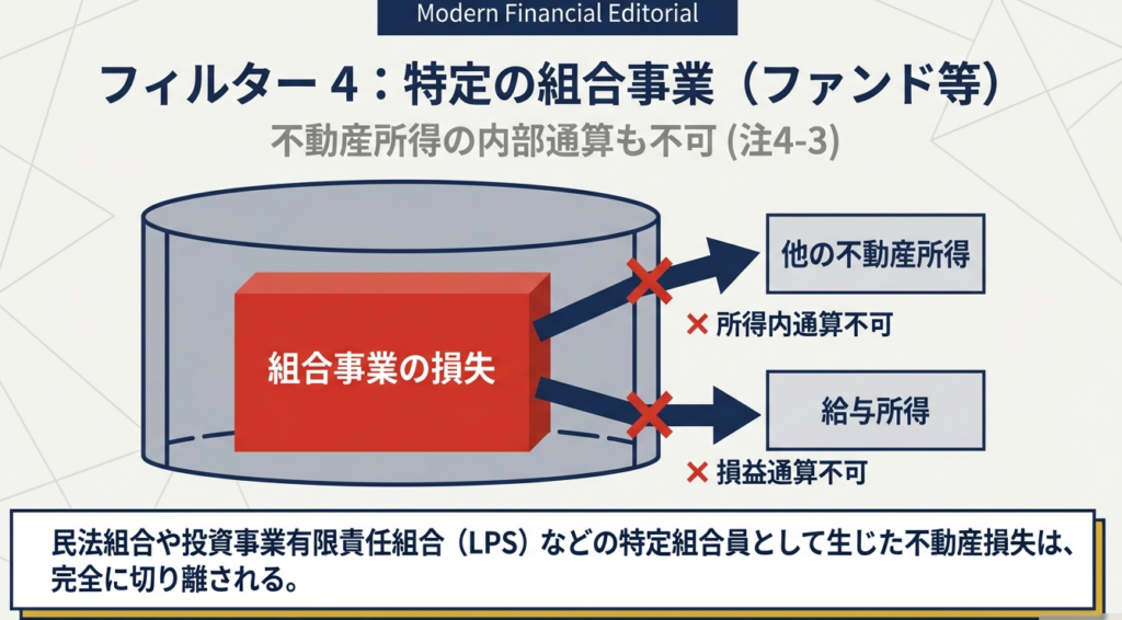 実務上、最も注意しなければならないのが「4つの所得に該当していても、通算が制限される例外規定」です。特に「内部通算(同じ所得区分内での相殺)さえ認められない」ケースは、申告ミスが起きやすい非常に危険なポイントです。