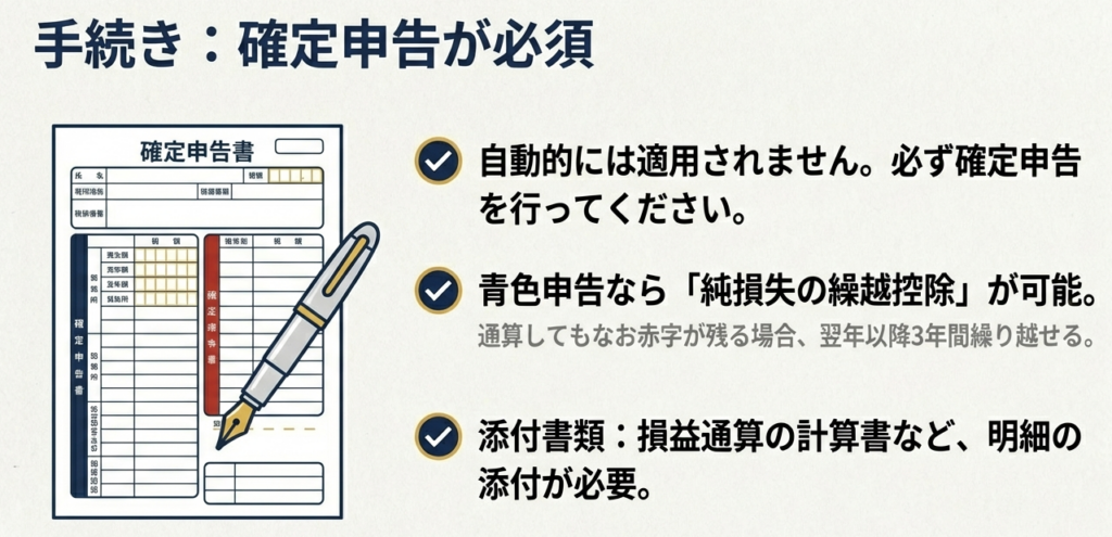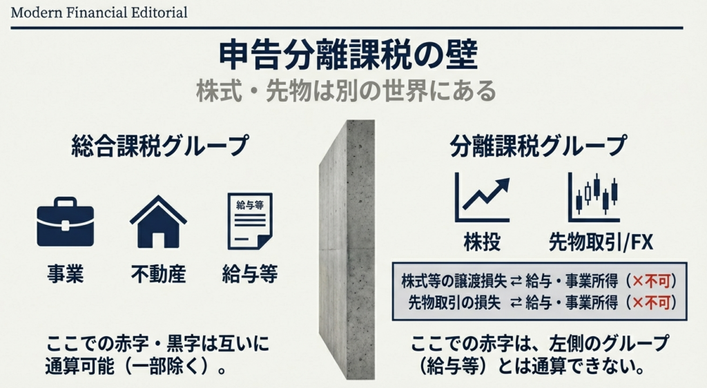 | 分離課税項目 | ・株式等に係る譲渡損失(原則) ・先物取引に係る雑所得等の損失 ・一定の居住用財産以外の土地建物等の譲渡損失 | 申告分離課税の対象となるこれらは、原則として総合課税の所得(給与等)との通算はできません。 |