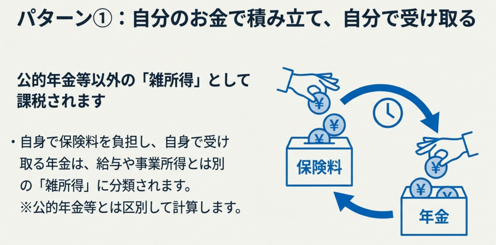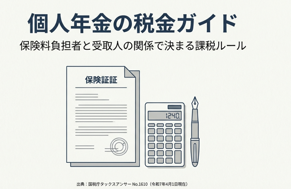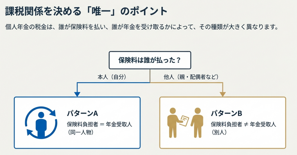 個人年金保険の課税関係は、保険料の負担者が誰であるか、および年金の受取人が誰であるかの組み合わせによって異なります。この「負担者」と「受取人」の同一性の有無が、所得税か贈与税かを分ける主要な要因となります。