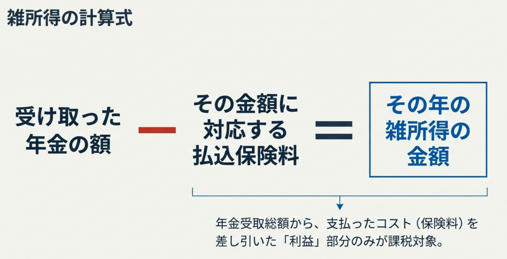 年金額から、その金額に対応する「払込保険料」を差し引いた金額が雑所得となります。