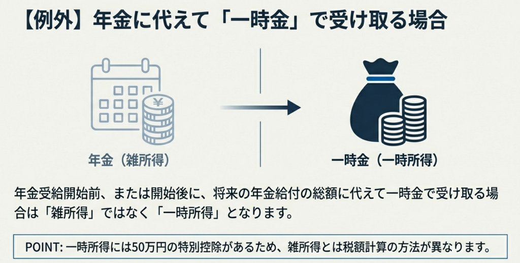 ここで注意すべきは、将来の年金給付に代えて「一時金」で受け取った場合です。この場合、所得区分は「雑所得」ではなく「一時所得」へと変質します。特別控除の有無など、税負担に大きな影響を与えるため、受取形式の確認は徹底してください。