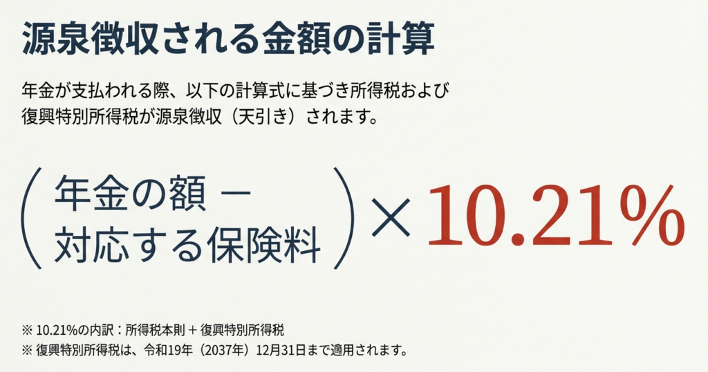 源泉徴収される税額は、「(年金の額 – その年金の額に対応する保険料または掛金の額)× 10.21%」という計算式で求められます。この10.21%には、所得税と復興特別所得税が含まれています。