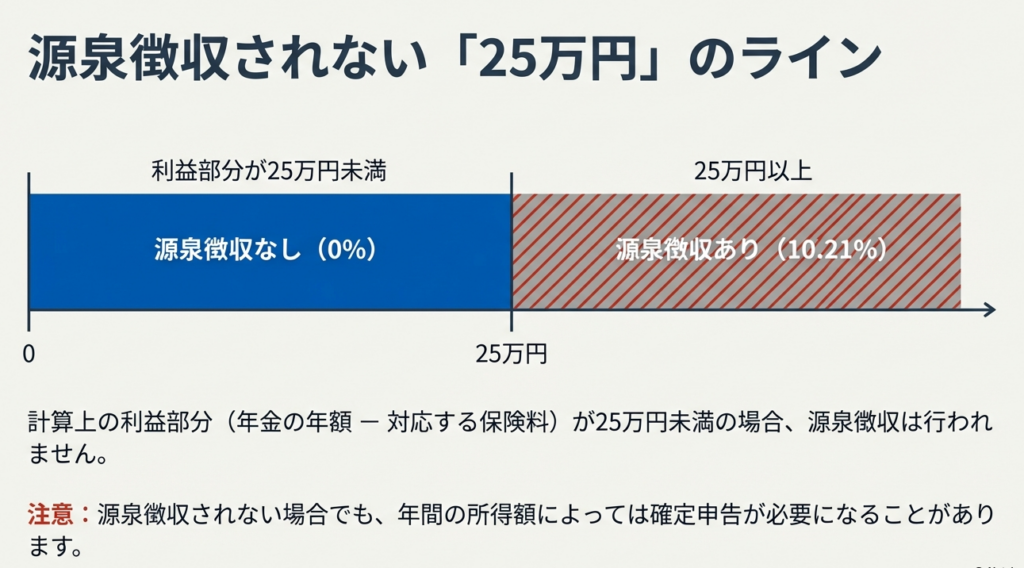 年金の年額から、それに対応する保険料または掛金の額を差し引いた残額(必要経費控除後の利益相当額)が25万円未満である場合には、源泉徴収は行われません。