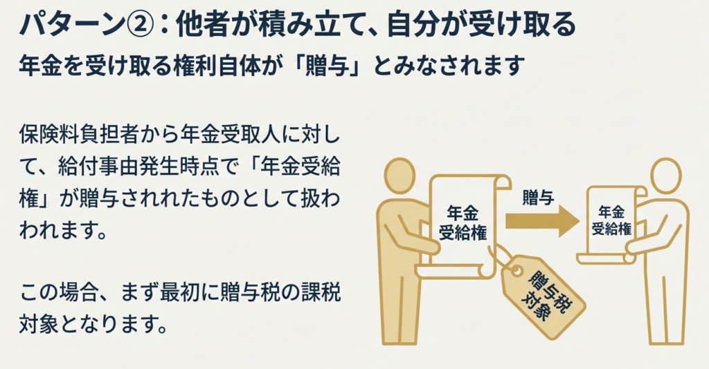 この場合、保険料負担者から受取人に対して「年金を受け取る権利」が贈与されたものとみなされます。そのため、給付事由が発生した時点で贈与税が課税されることになります。