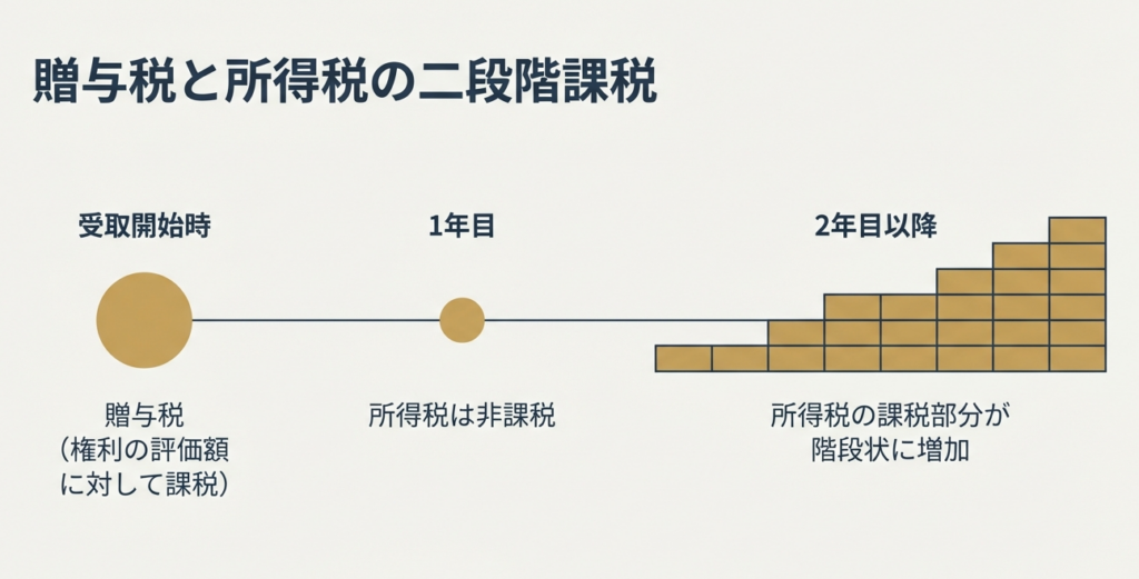 ◦ 税目: 贈与税(受給開始時) + 所得税(受取2年目以降)