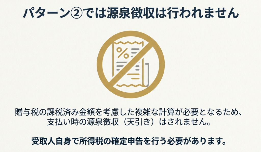 ◦ 源泉徴収: 無し(受取人が自分で申告する必要があります)