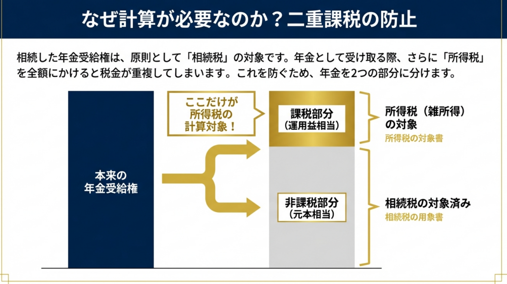 相続によって年金受給権を引き継いだ場合、その権利自体は「相続税」の課税対象となります。しかし、実際に年金を受け取り始めると、その支払額は「所得税(雑所得)」の対象にもなり得ます。ここで何も調整を行わないと、同一の資産に対して相続税と所得税が二重に課されることになってしまいます。