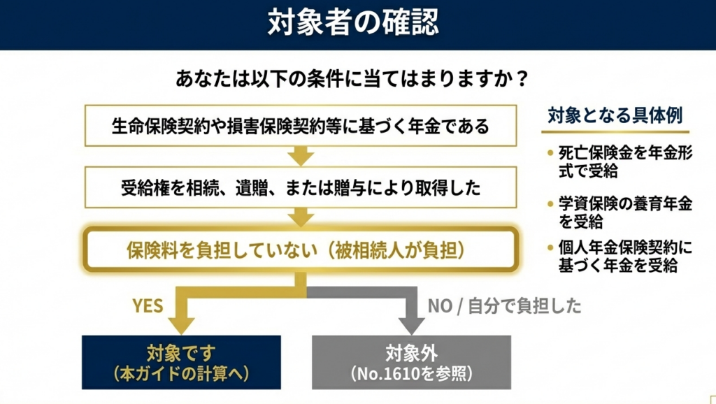 対象となるのは、「保険料の負担者ではない者」が、相続、遺贈、または贈与により年金受給権を取得したケースです。以下の3パターンを基本として押さえてください。