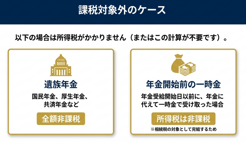 対象となりません。国民年金法や厚生年金保険法等の規定により、遺族年金は非課税とされているため、本資料の計算ルールの枠外となります。
