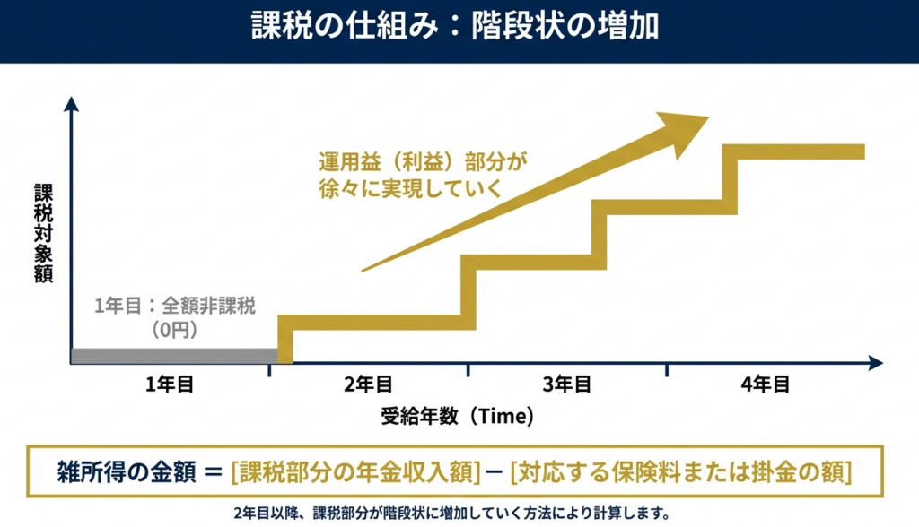 • 2年目以降:課税部分が「階段状」に増加