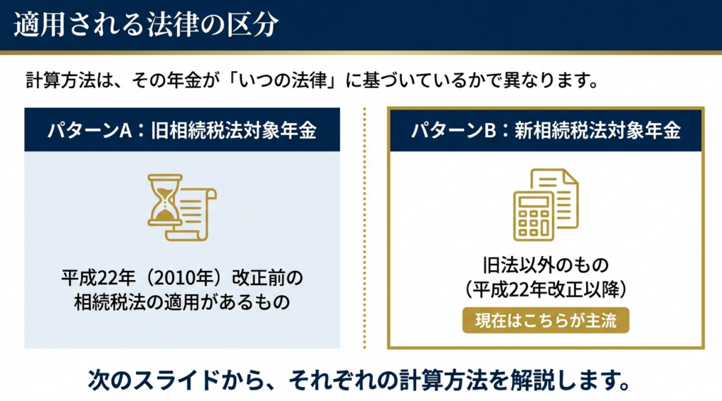 まず確認すべきは「契約日(権利発生日)」です。平成22年(2010年)の改正前のルールが適用される「旧相続税法対象年金」もありますが、現在我々が扱う多くは「新相続税法対象年金」です。