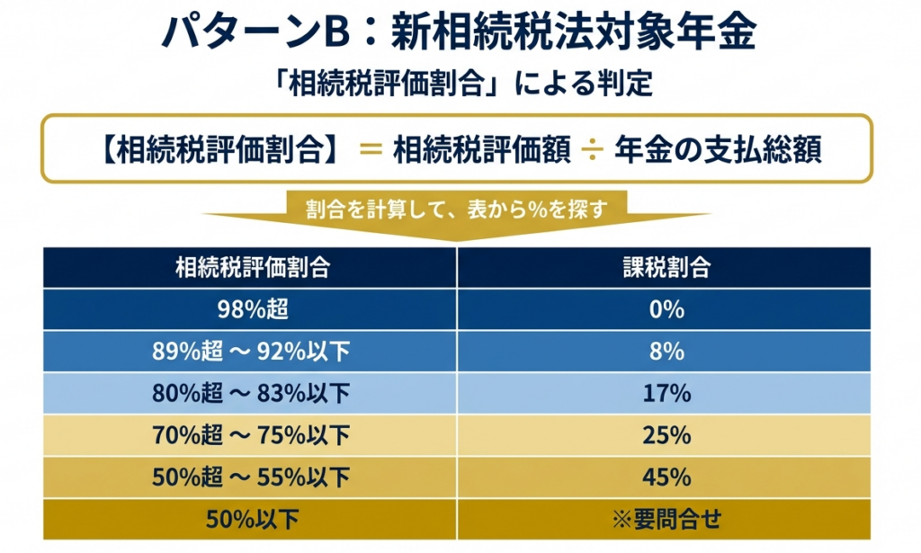 問7: 「新相続税法対象年金」における「課税割合」を決定するために必要な「相続税評価割合」の算式を説明してください。
