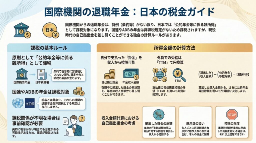 結論から申し上げますと、国際機関から受給する退職年金は、日本での居住者として受け取る以上、原則として日本の所得税の課税対象となります。