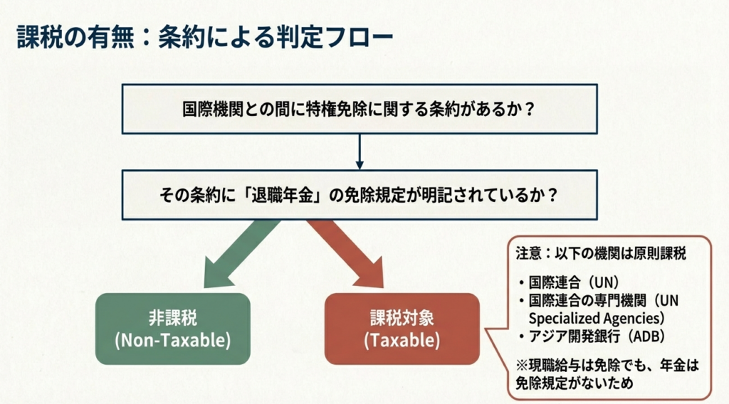 皆さんがクライアントの経歴を確認する際は、単に「国際機関」と一括りにせず、過去の勤務先がどこであるかを正確に把握してください。例えば、国連系であれば「特権及び免除に関する条約」、アジア開発銀行であれば「設立協定」といったように、根拠となる法規範が異なります。この「どの組織か」という特定が、課税の適否を判断する法的根拠(条約等)を特定するための第一歩となるのです。