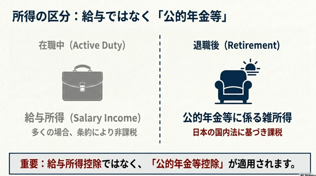 しかし、現役時代の給与が非課税であっても、退職後の「年金」については全く別の論理が適用されます。この点を見落とし、安易に非課税と判断して申告漏れが生じた場合、クライアントは多額の追徴課税という不利益を被ることになり、ひいては当事務所への信頼を損なう重大なリスクにつながります。