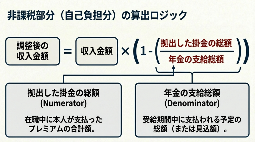 計算上の収入金額 = 年金受領額 × (1 - 受給者が拠出した掛金の総額 ÷ 年金の支給総額)