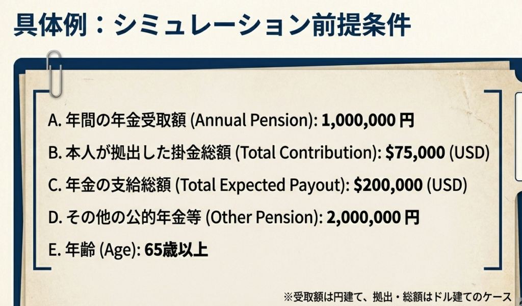 所得金額は、年金収入から公的年金等控除額を差し引いて計算します。ただし、在職中に本人が掛金を拠出していた場合は、受け取った年金のうち自己負担分に相当する金額を収入から控除する計算を行います。なお、外貨で受け取る場合は、受給日の為替レート(TTM)で日本円に換算します。