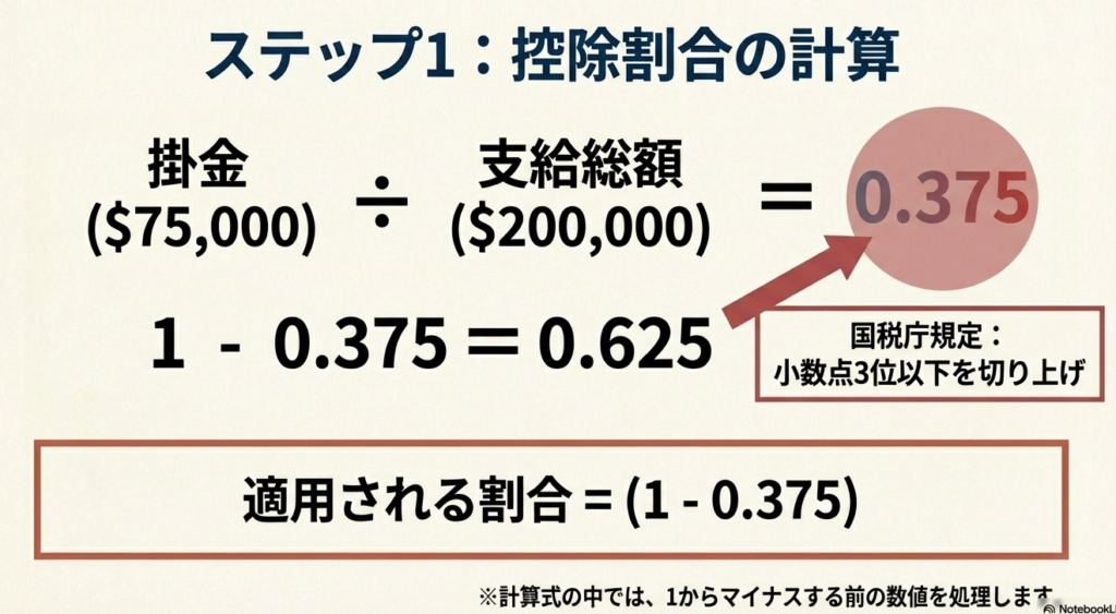 上記の計算式の「割合(1 - 拠出総額/支給総額)」は、小数点以下2位まで算出し、3位以下を切り上げる必要があります。これは税務調査でも細かくチェックされるポイントですので、絶対に忘れないでください。