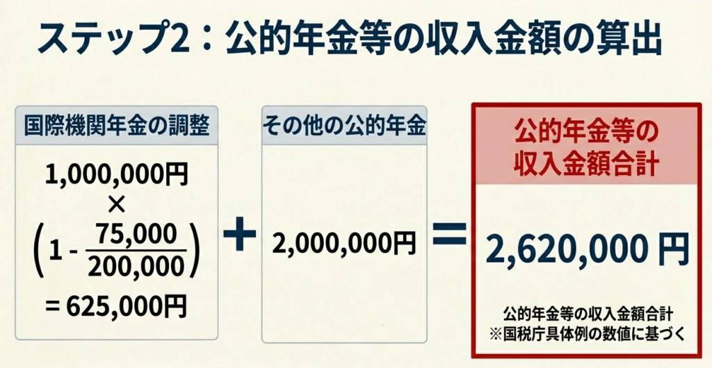 国際機関からの年金に係る所得金額の計算は、通常の公的年金等の計算をベースとしつつ、本人の拠出金を考慮する特殊なステップが含まれます。