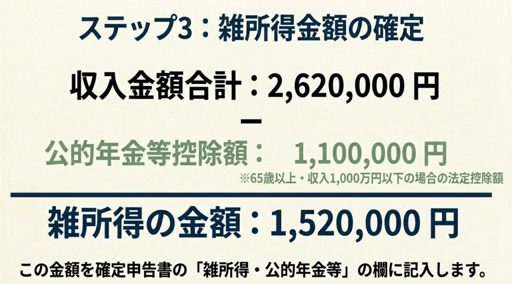 公的年金等に係る雑所得の金額 = [収入金額 - 公的年金等控除額]