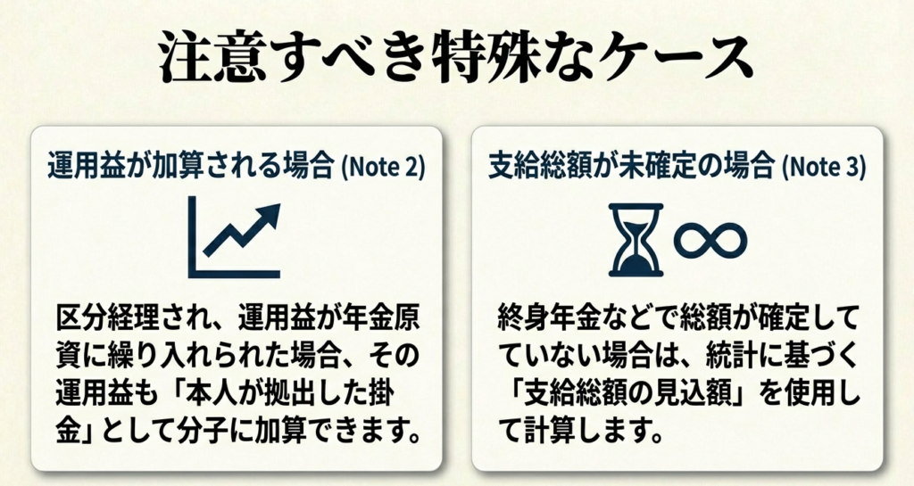 区分経理されている掛金の運用益が年金原資に繰り入れられている場合、その運用益は「本人が拠出した掛金」に加算して計算できます。