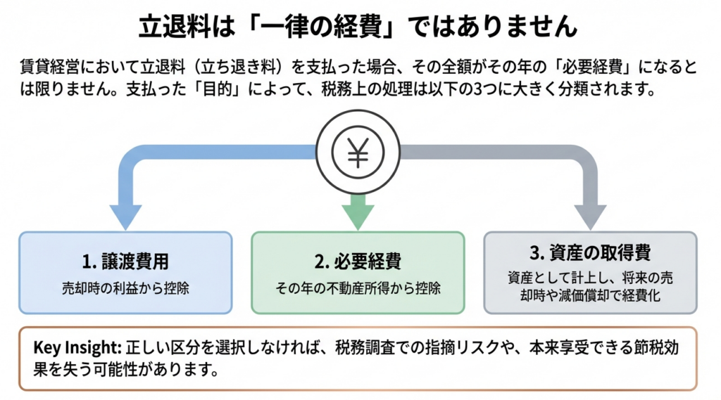 私たちが税務判断を行う際、最も大切にすべきは「費用収益対応の原則(収益を得るためにかかった費用を、その収益と対応させて計上する考え方)」です。立退料が「将来の売却益」を生むためのものか、「日々の賃料収入」を維持するためのものかによって、税務上の扱いは劇的に変わります。