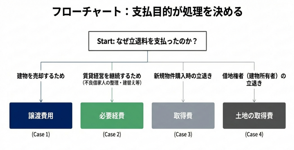 立退料の税務処理は、一律ではありません。国税庁の指針(令和7年4月1日現在)に基づくと、「支払いの目的」によって以下の4つの区分に整理されます。