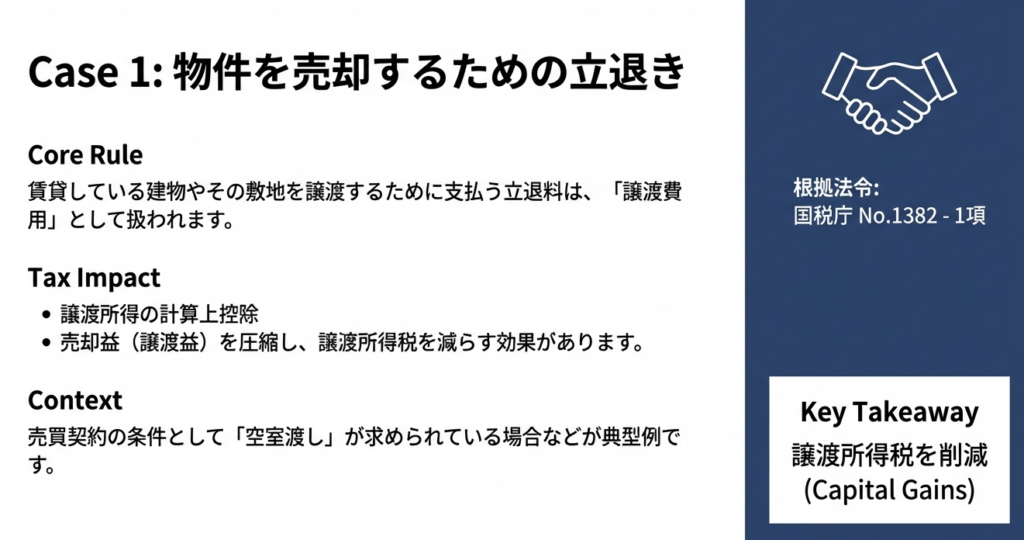 その建物や敷地を売却するために立ち退きを求めた場合の立退料は、譲渡所得の計算において「譲渡費用」として扱われ、売却益から控除されます。