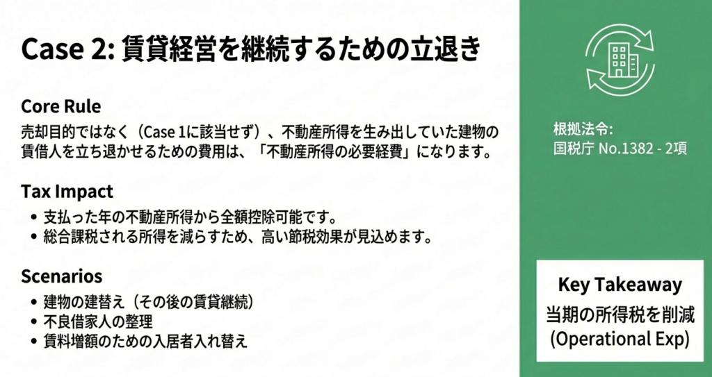 不動産所得の「必要経費(ケース2)」になれば、最大55%の累進課税がかかる所得を直接圧縮できます。一方、「譲渡費用(ケース1)」は分離課税(約20%または39%)の対象となる譲渡所得から差し引くため、節税の「効き目」が異なります。