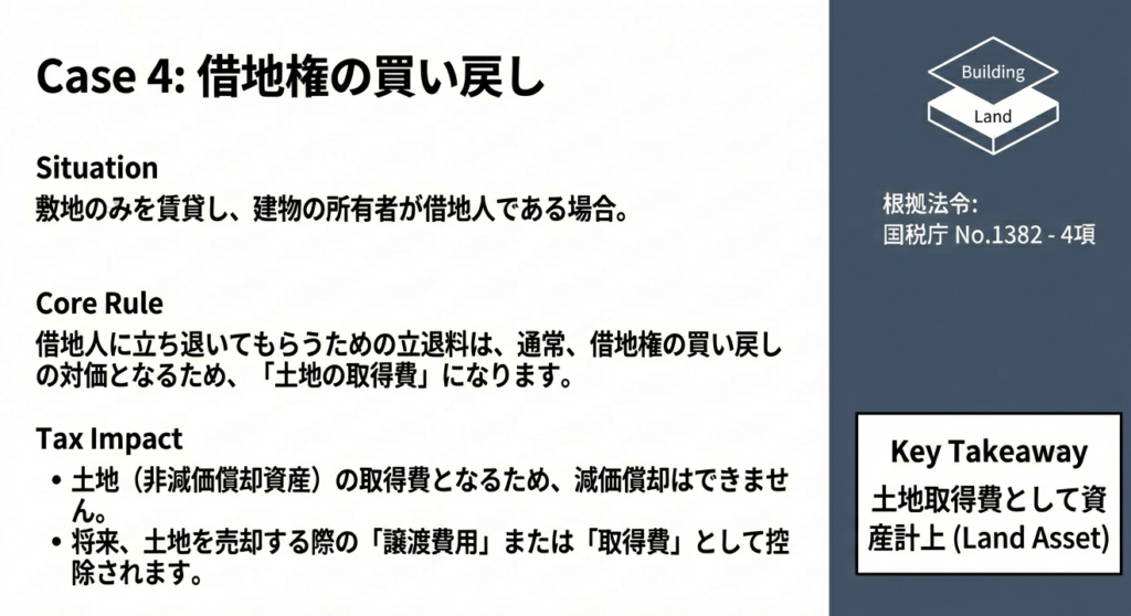 • 考え方: 土地の所有者が、他人の持っていた「借地権」という権利を買い戻し、完全な所有権を取り戻す行為とみなされるため、土地という資産の購入代金と同じ扱いになります。