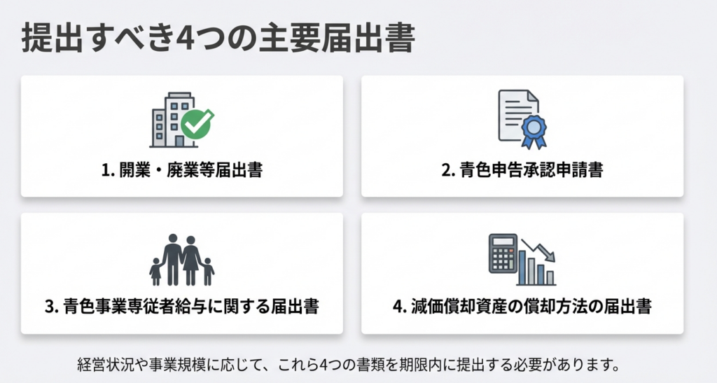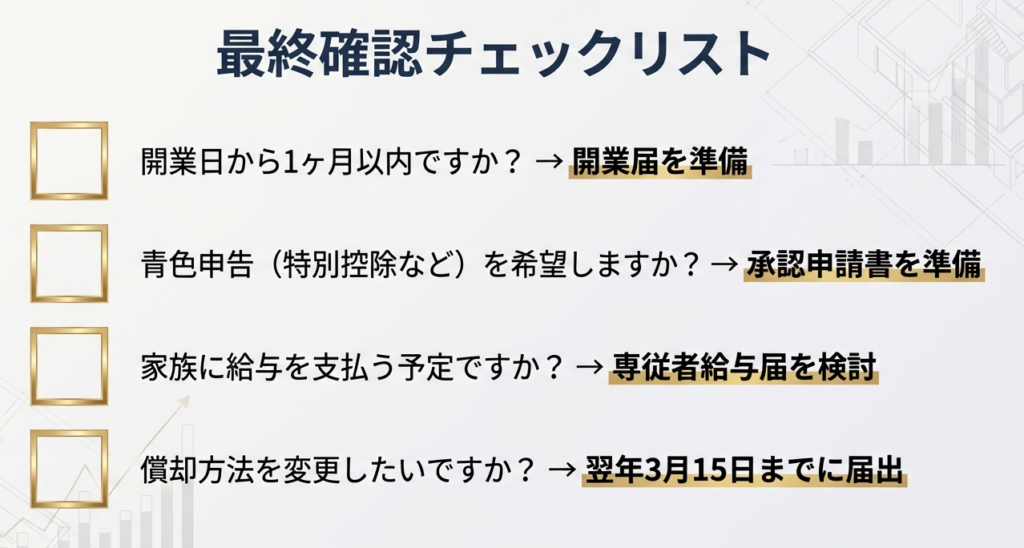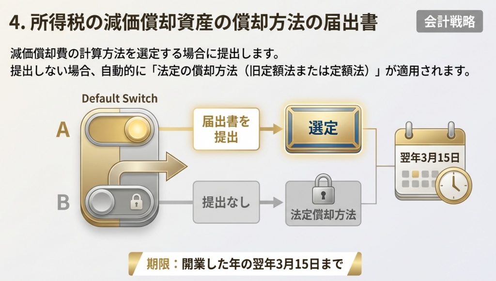 | 所得税の減価償却資産の償却方法の届出書 | 開業した年の翌年3月15日まで | 規定: 届出がない場合は法定の「定額法」となります。資産の性質に合わせた適切な選定が求められます。 |