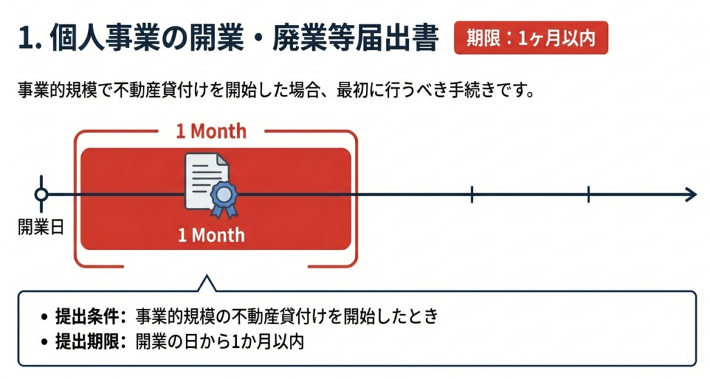 事業的規模で貸付けを行う場合、開業日から1か月以内に提出が必要です。