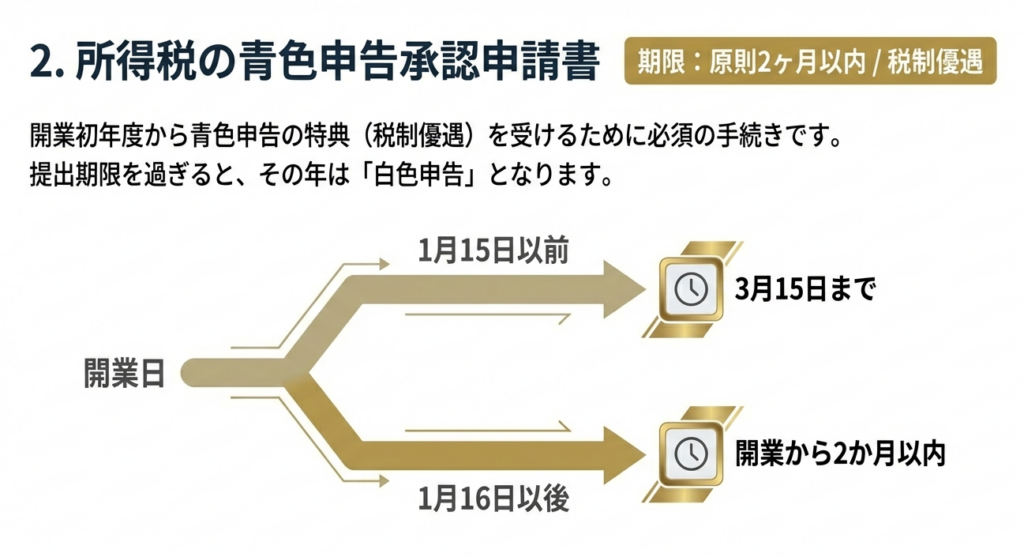 | 所得税の青色申告承認申請書 | ・1月15日以前の開業:3月15日まで ・1月16日以降の開業:開業から2か月以内 | 最大のリスク: 期限を1日でも過ぎるとその年は白色申告となり、特別控除等の特典が一切受けられません。 |